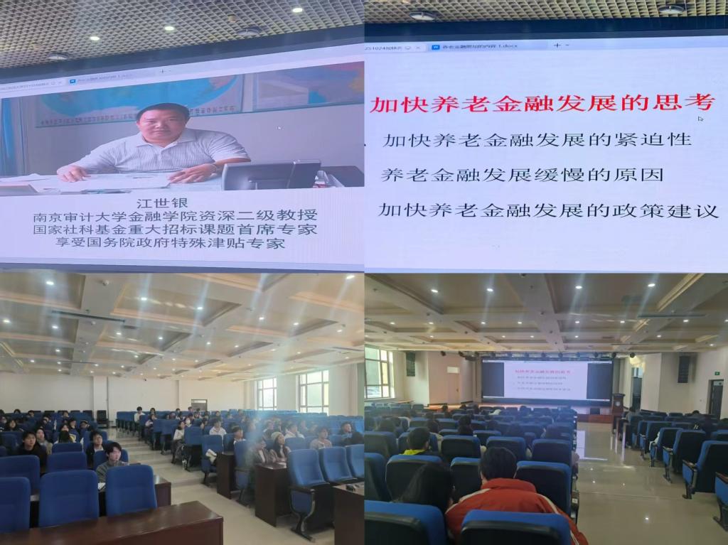 10月28日,经济学院学院邀请南京审计大学二级教授、博士生导师江世银教授作了题为《加快养老金融发展的思考》的学术报告。本次报告会采用线上线下同步的方式进行,相关专业教师、研究生、本科生200余人参加此次报告会,报告会由经济学院副院长孙璐主持。