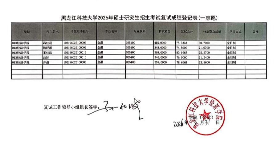 黑龙江科技大学2026年硕士研究生招生考试复试成绩登记表(一志愿)